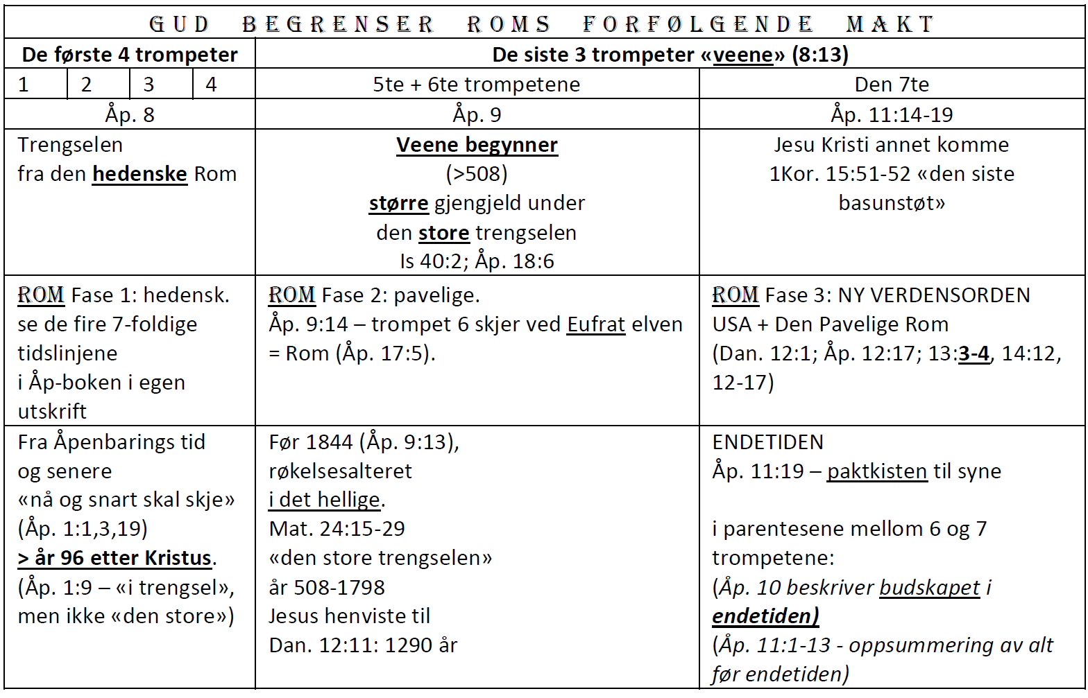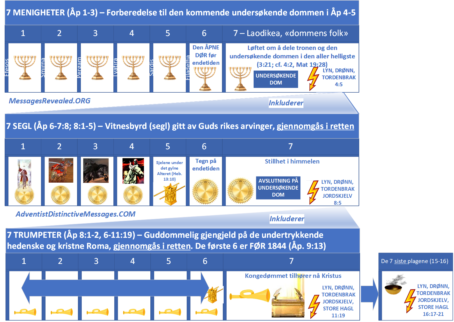 Resources (Norwegian) Click to download these PDF files. (a separate download page will open) PDF: 2018-10-23-I Åp 4 – de parallelle visjonene PDF: 2018-10-23-II Åp 4 – Jesus foran retten i det aller helligste PDF: 2018-10-23-III Åp 4-5 de 24 eldste PDF: 2018-10-30 Åp 5 – bokrullen PDF: 2018-10-30 Åp 5 – seglene PDF: 2018-11-13 Åp 6 PDF: 2018-11-20 Åp 7 PDF: 2018-11-27 Åp 8 PDF: 2019-02-09 Åp 8 forkortet tabell, kun om trompetene PDF: 2018-12-04 Åp 9 PDF: 2018-12-11 Åp 10 PDF: 2019-04-09 Åp 19 Åpenbaringsbokens struktur – nøkkelen til å forstå det meste